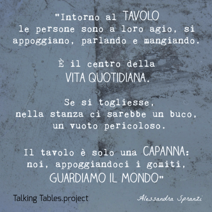 La tavola ci mette l’uno di fronte all’altro e il cibo accompagna il flusso di emozioni che circolano in quel micro universo racchiuso nei confini della tavola, noi raccontiamo tutto questo. Diamo voce alle Talking Tables che più ci colpiscono.